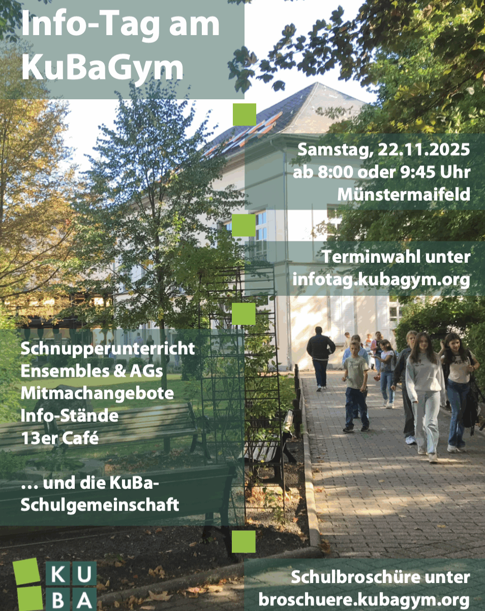 Wenn Ihre Kinder und Sie gemeinsam einen Eindruck vom KuBaGym, von seinen Schülerinnen und Schülern, von den Lehrerinnen und Lehrern, den verschiedenen Arbeitsgemeinschaften und Ensembles, von den Gebäuden, dem Park und natürlich vom Unterricht gewinnen wollen, kommen Sie zu uns! Für Ihren Besuch reservieren Sie sich bitte vorab einen Besuchszeitraum unter