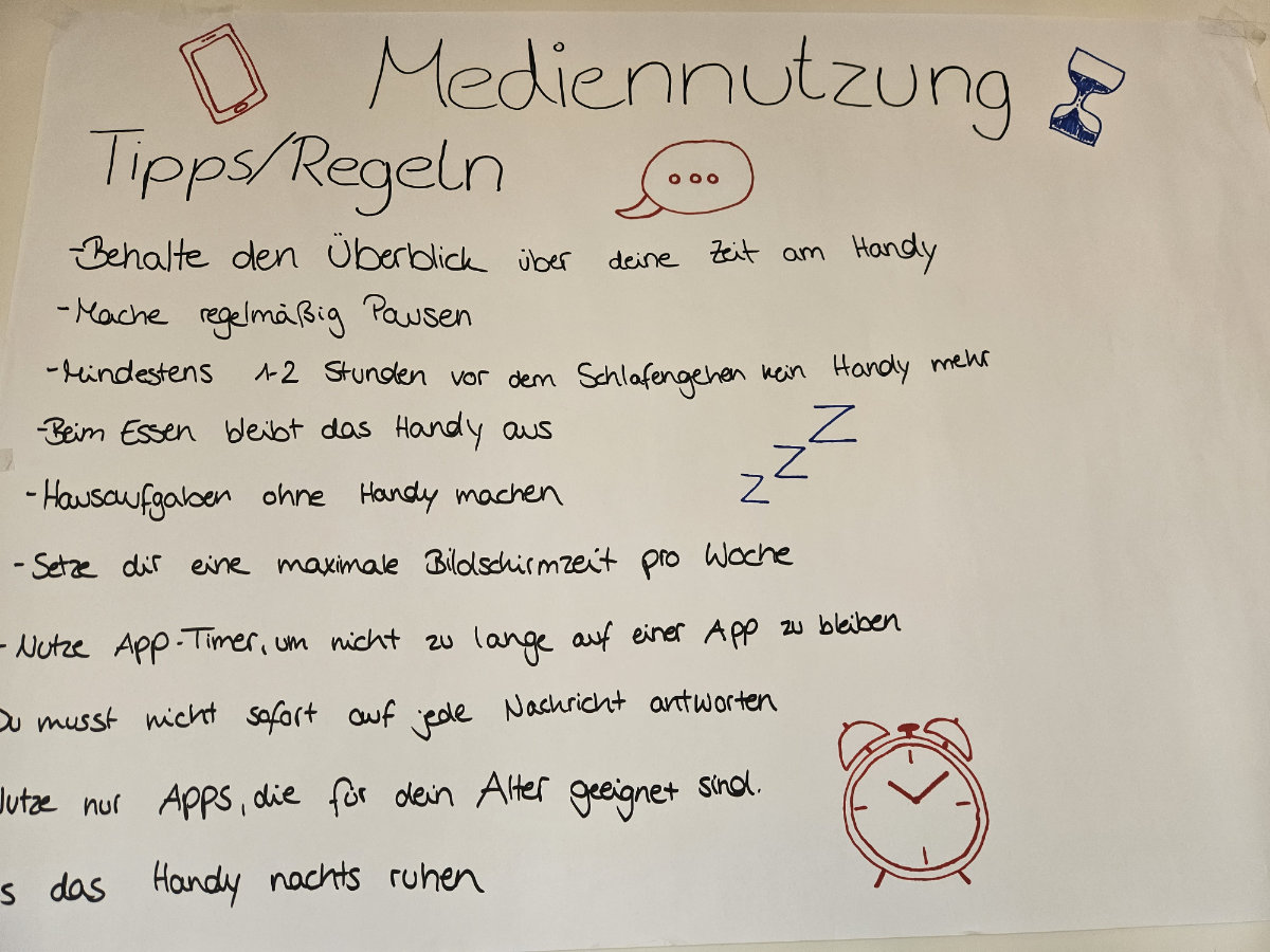 In den vergangenen beiden Wochen fanden in unseren vier 5. Klassen jeweils zwei Medienworkshops durchgeführt von den Paten der Klassen und ihren Klassenleitungen statt. Nachdem die Paten (10. Klässler) inhaltlich vom schulinternen Team der Medienprävention „ausgebildet“ wurden, leiteten sie motiviert und gut vorbereitet die Workshops und trugen dankenswerterweise mit dazu bei, den 5ern einen interaktiven und kindgerechten Zugang zur Mediennutzung zu bieten: Der erste Workshop drehte sich dabei insofern um das eigene Mediennutzungsverhalten, dass sich die Schüler neben grundsätzlichen Definitionen von z.B. dem „Internet“ oder „Sozialen Medien“ der Frage widmeten, wie viel Zeit sie pro Tag eigentlich im digitalen Raum verbringen. Abgeschlossen wurde dieser erste zweistündige Teil durch ein kleines interaktives Experiment, in dem der Ablenkungsfaktor Smartphone im Rahmen des Erledigens der Hausaufgaben simuliert worden ist. Schließlich einigte man sich auf verschiedene Regeln bzw. formulierte Tipps für einen sinnvollen Umgang mit Medien, speziell dem Smartphone (nicht Handy 😊).