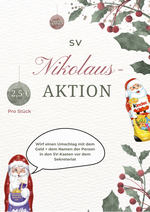 es ist wieder so weit: Ihr könnt euren Freunden, Klassenkameraden oder einfach besonderen Menschen eine kleine Freude machen und ihnen einen Schoko-Nikolaus zum Nikolaus schenken. Dafür müsst ihr lediglich einen Briefumschlag mit 2,50 €, sowie dem Namen und der Klasse der Empfängerin oder des Empfängers vorbereiten und diesen in den SV-Briefkasten im Sekretariat werfen.📮🧑🎄