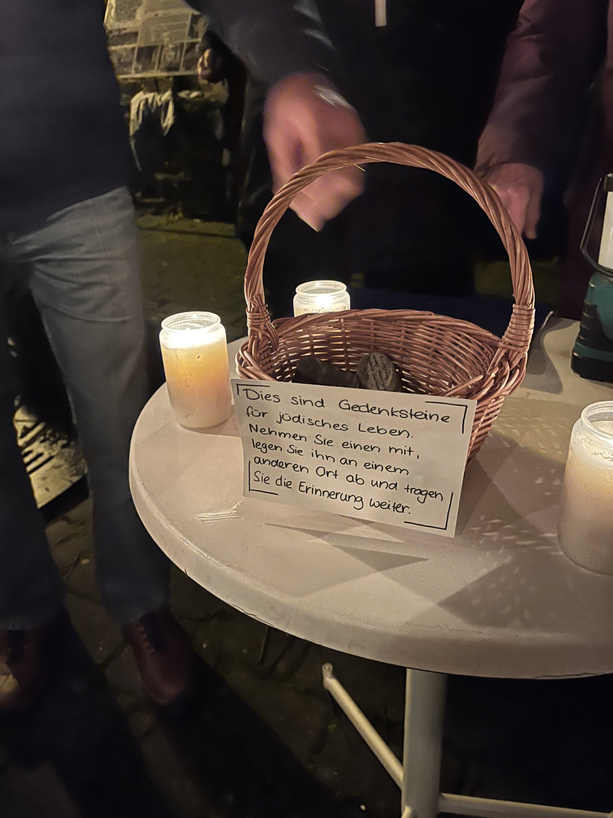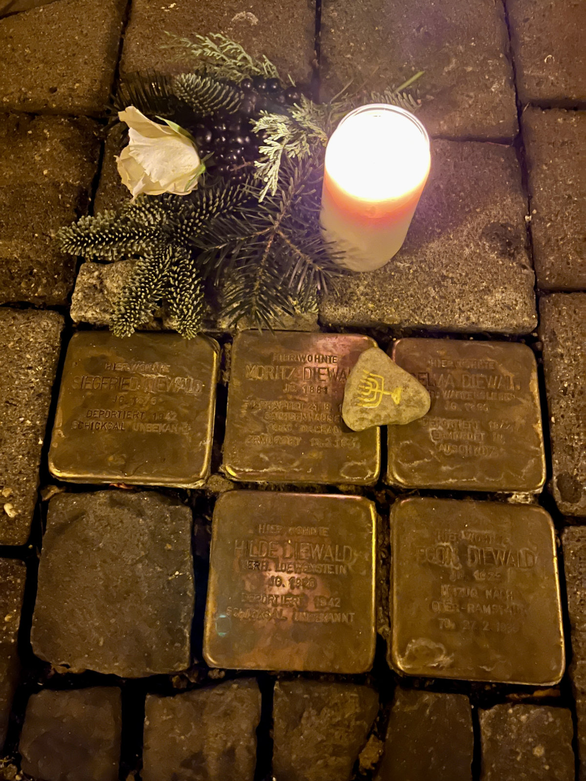 Nach einer Andacht in der Kirche, bei der Konfirmandinnen und Konfirmanden ihre Betroffenheit über die Geschehnisse im Holocaust zum Ausdruck brachten, machten sich die etwa 130 Teilnehmer auf den Weg zur Synagoge. Dabei haben Schülerinnen und Schüler aus der Jahrgangsstufe 13 diesen Weg gestaltet. Zu Beginn wurde den Teilnehmern jüdisches Gebäck gereicht, um auch noch einmal zu verdeutlichen, welch kultureller Verlust mit der Vertreibung und Ermordung einherging. Auf einem Flyer waren einige wichtige Angaben über das Leben von Edith Bender zusammengefasst. Ihr Bild, in Puzzleteile zerschnitten wurde ausgeteilt, um es vor der Synagoge gemeinsam zusammenzusetzen. Unterwegs machte der Zug am Haus Untertorstr. 6 halt, in dem Edith gewohnt hatte. In einer Ansprache an die Teilnehmer brachten die Schülerinnen und Schüler ihre Besorgnis über rechtspopulistische und faschistische Entwicklungen in der Welt heute zum Ausdruck. An der Synagoge wartete der Unterstufen-Schulchor, um dem dortigen Gedenken einen feierlichen Rahmen zu geben. Bemalte Steine luden dazu ein sie mitzunehmen und an anderer Stelle abzulegen, um das Gedenken auch an andere Orte weiterzutragen. Die Vertreter der SV verlassen schließlich die Namen der Vertriebenen und Ermordeten aus Münstermaifeld, bevor das Gedenken mit dem jüdischen Totengebet endete.